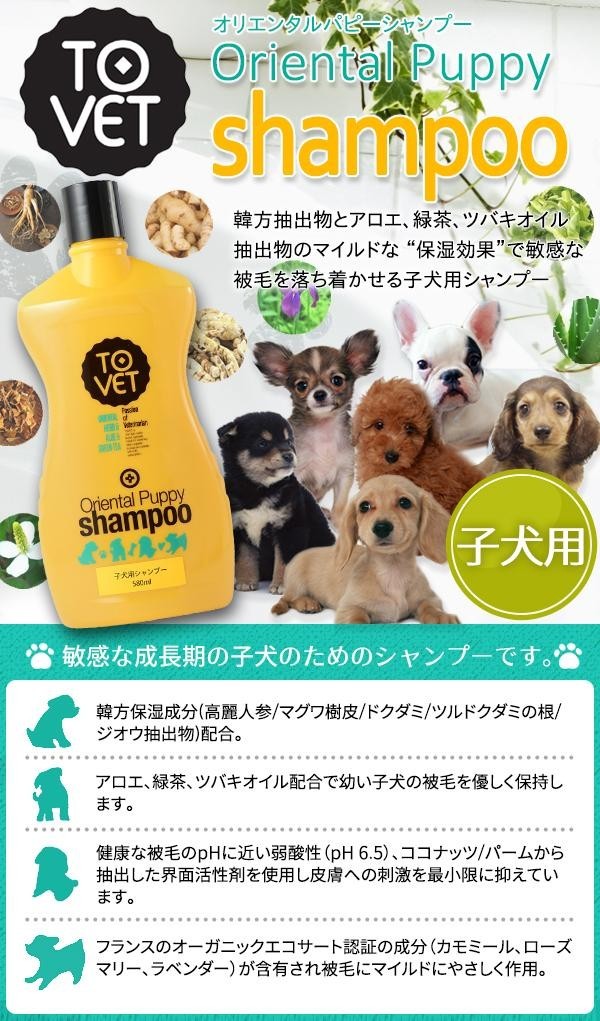 | 韓方抽出物とアロエ、緑茶、ツバキオイル抽出物のマイルドな「保湿成分」で敏感な被毛を落ち着かせる子犬用シャンプーです。 |