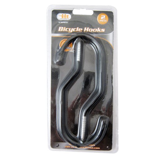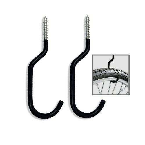2pc Ceiling Bike Storage Hooks PVC Pad Lifetime Warranty ! A single bike on a kick stand occupies up to 18 square feet of your most-desirable garage floor area; making it more difficult to park vehicles or even walk through the garage. And although we have only anecdotal evidence, it seems a falling bike is magnetically attracted to dent and/or scratch the most-obvious area of an automobile. These bike hooks are a simple effective solution that takes just seconds to install; drill pilot hole in ceiling joist or wall stud and twist-in hooks until tight. One pair suspends one bike by front and rear wheels; great for garden hoses other hard-to-store items, too. Installs quickly and easily with 5/16" pilot hole. 0