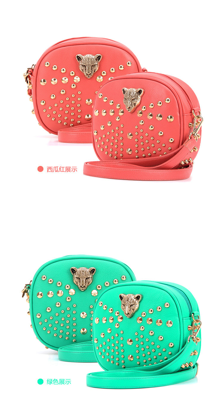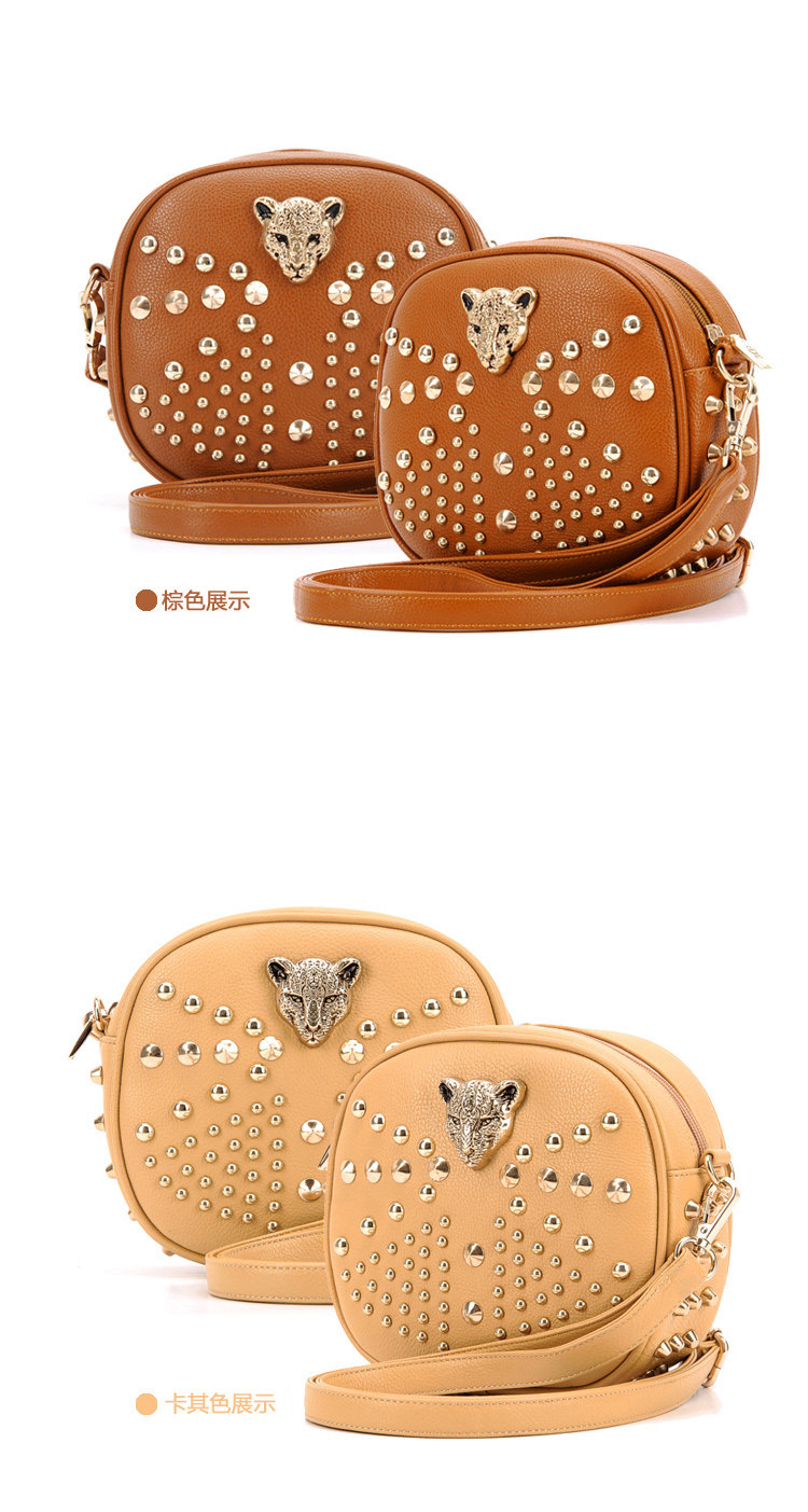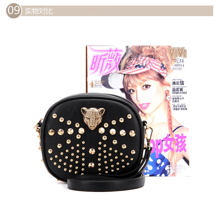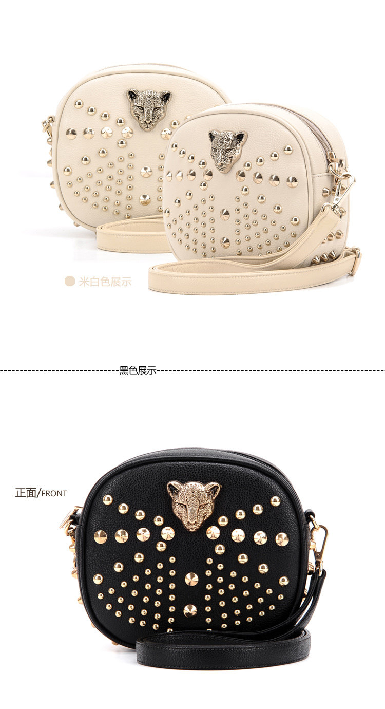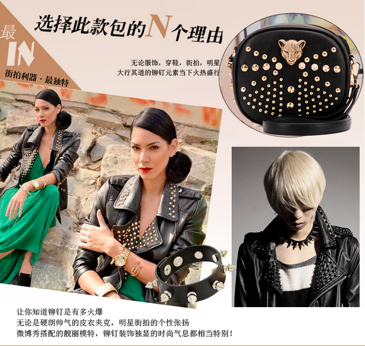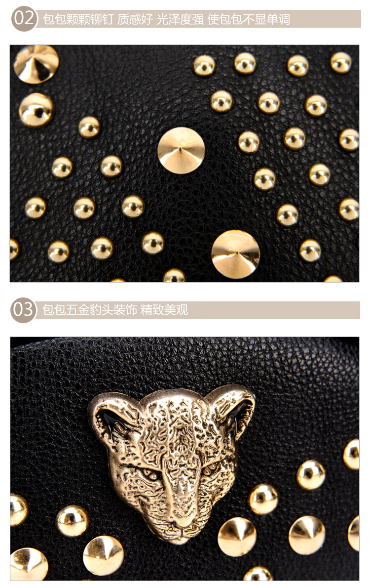 新款潮欧美街头朋克风豹头柳钉包。内部1个拉链袋,2个置物袋