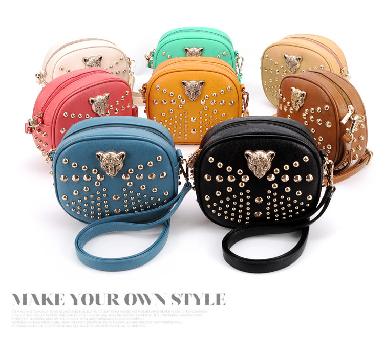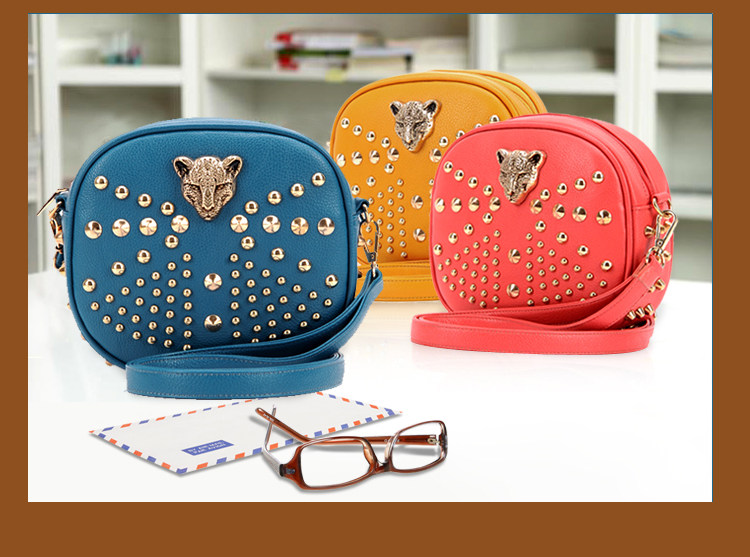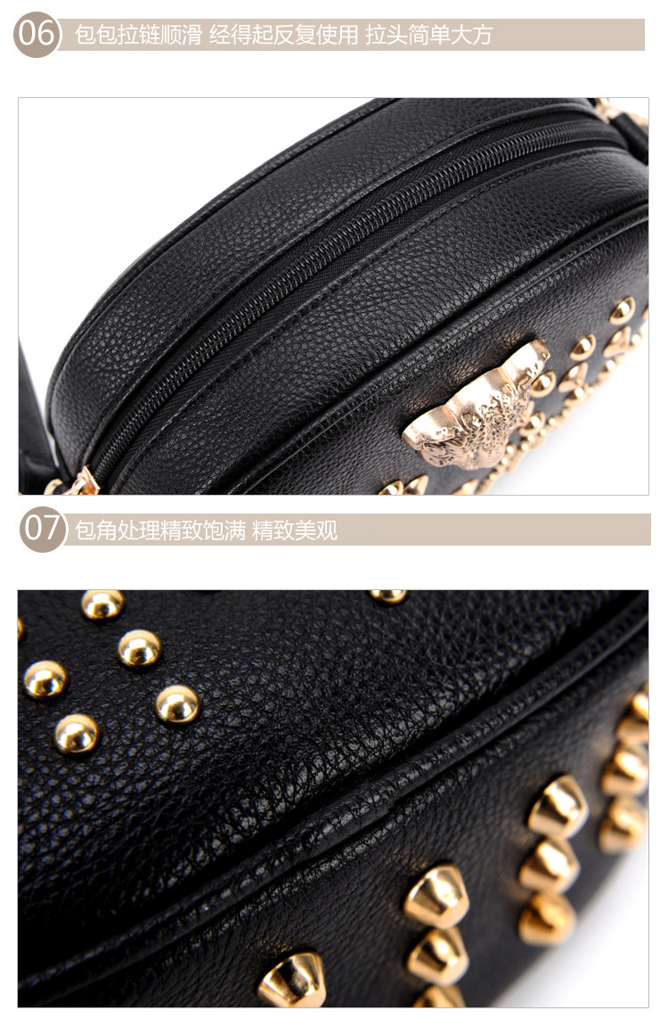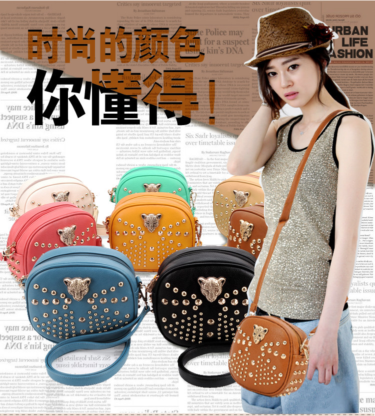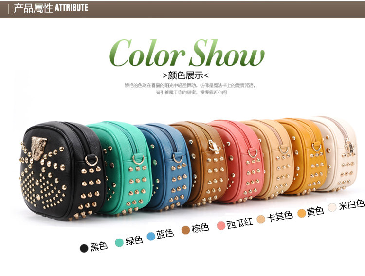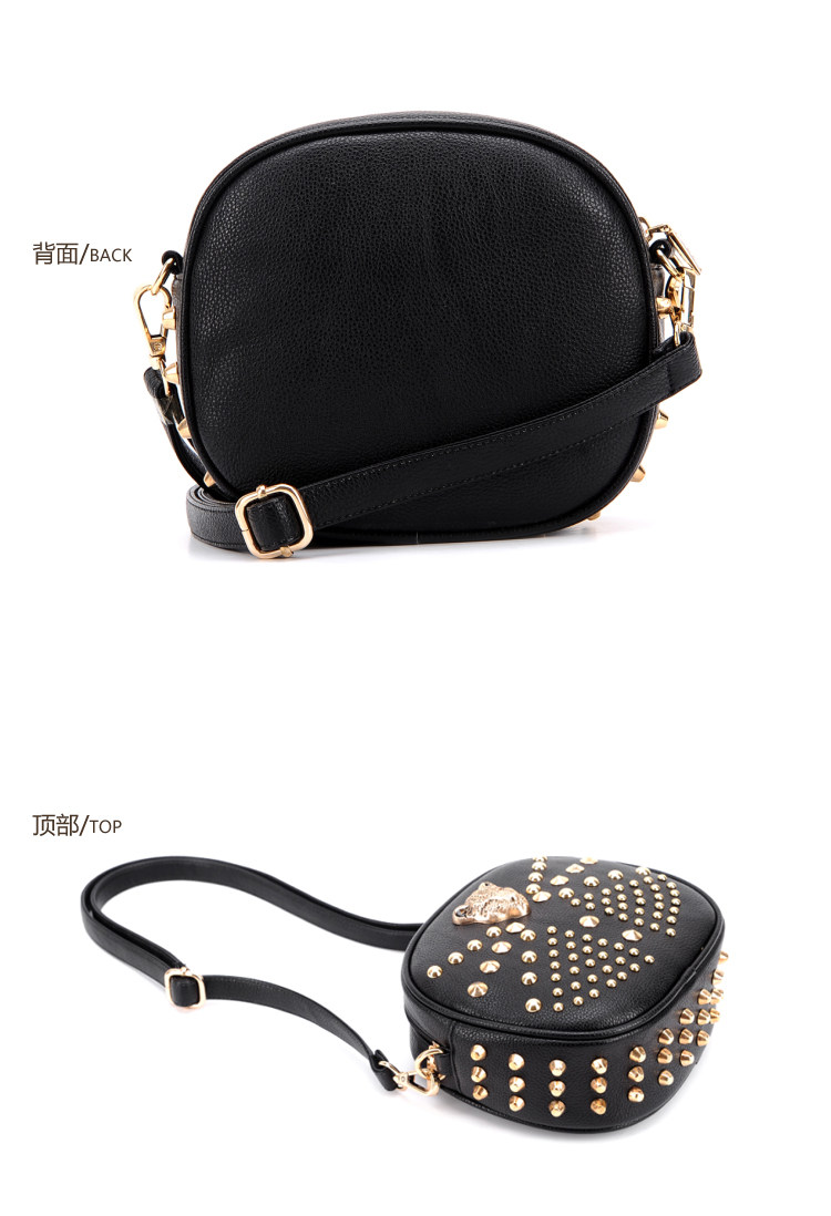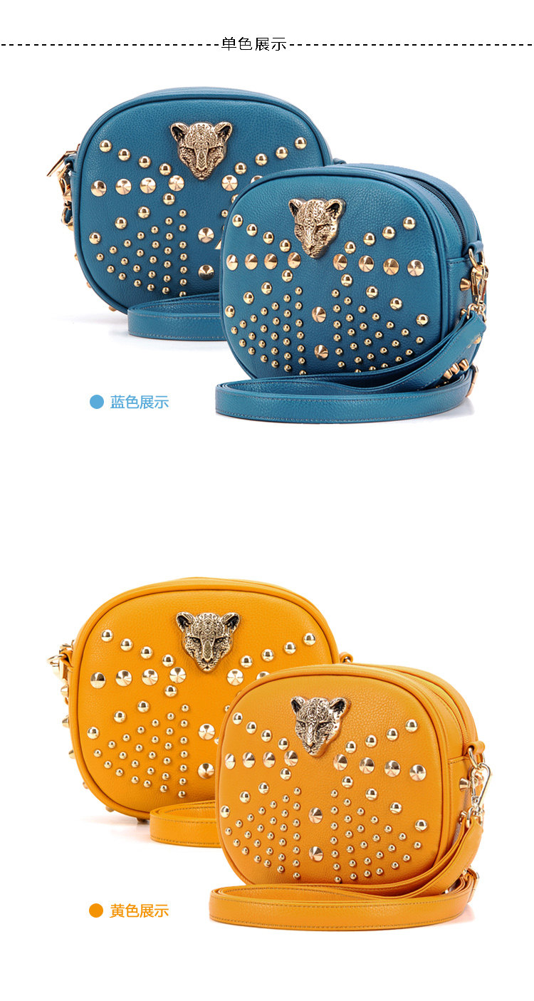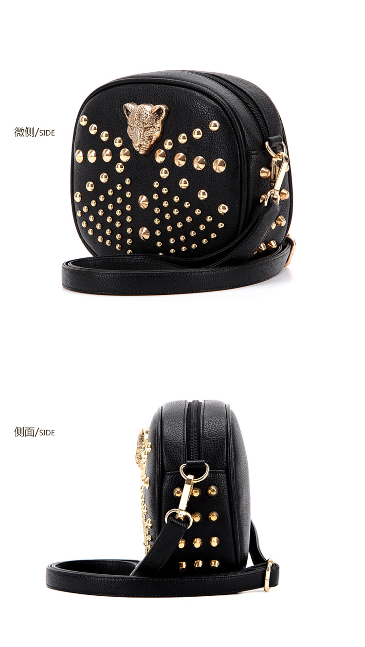 新款潮欧美街头朋克风豹头柳钉包。内部1个拉链袋,2个置物袋