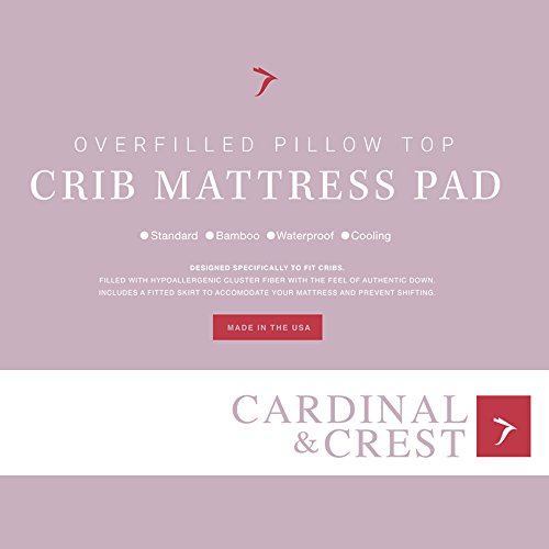 -. Brand : Cardinal & Crest -. Color : White -. Feature : IDEAL FOR KIDS - This 27.5-inch by 52-inch bamboo from rayon mattress pad is designed to fit most cribs and toddler beds to create a comfy place for little ones to sleep / BAMBOO FROM RAYON SOFT PROTECTION - Super-soft and thick pad for more comfort; Features a comfortable fill with a box stitch to prevent the fill from shifting or moving around during sleep / HYPOALLERGENIC MATERIALS - Lush rayon cover filled with hypoallergenic alternative down fiber; Helps regulate body temperature while allowing mattress to cool / EASY TO CLEAN - Our pads are machine washable, so you can toss them in the wash whenever it needs a refresh; See instructions for more details / EXCEPTIONAL QUALITY - Cardinal & Crest mattress pads are made in the U.S. by a veteran-owned company; Backed by a 100 percent money-back guarantee -. MPN : CCCrib Pad -. PartNumber : CCCrib Pad -. ProductGroup : Home -. ProductTypeName : HOME_BED_AND_BATH -. Title : Crib-Size Overfilled Pillow Top Crib Mattress Pad