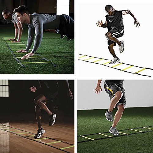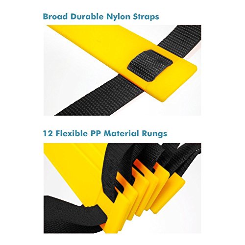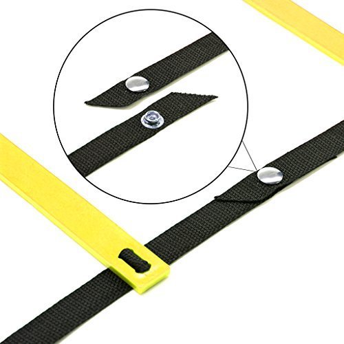 -. Feature : This agility ladder is 10/20 feet long, with 5/12 Premium Heavy-duty plastic rungs which are flat ( no ankle rollover ) for ultimate speed training. / Having the steps in the agility ladder adjustable allows for the ladder itself to move when you make a mistake, rather than you falling over. Especially when the ladder is held down with its ground stakes during outdoor use / The speed or agility ladder is a device employed to improve feet speed, agility and co-ordination. High intensity training can be doing both indoors and outdoors. / Suitable for athletic training, football, basketball, tennis, badminton, rugby and so on. It is also suitable for agility training of teenagers / Connecting buckles on the two sides of the straps which allows you to extend the training ladder at your will. Perfect For Beginners and Pros