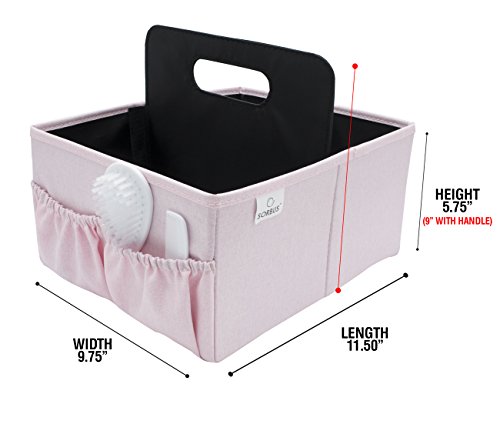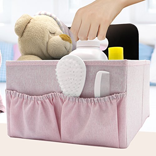 Store all your baby, infant, and kid supplies in this adorable multi-compartment organizer. It's a stylish way to keep diapers, wipes, ointments, and many other essentials handy. You can separate the caddy using the Velcro insert divider to fill both sections with specific products, or you can detach the insert for larger items like blankets and towels. The outside pockets are big enough to hold small creams and grooming tools, but versatile enough for adult personal items. Now parents can keep products within reach at home or on the go. The portable handle makes it easy to carry around the house and folds flat for storage. As your baby grows, this caddy can be used for toys, books, art supplies, or mama's make-up caddy!