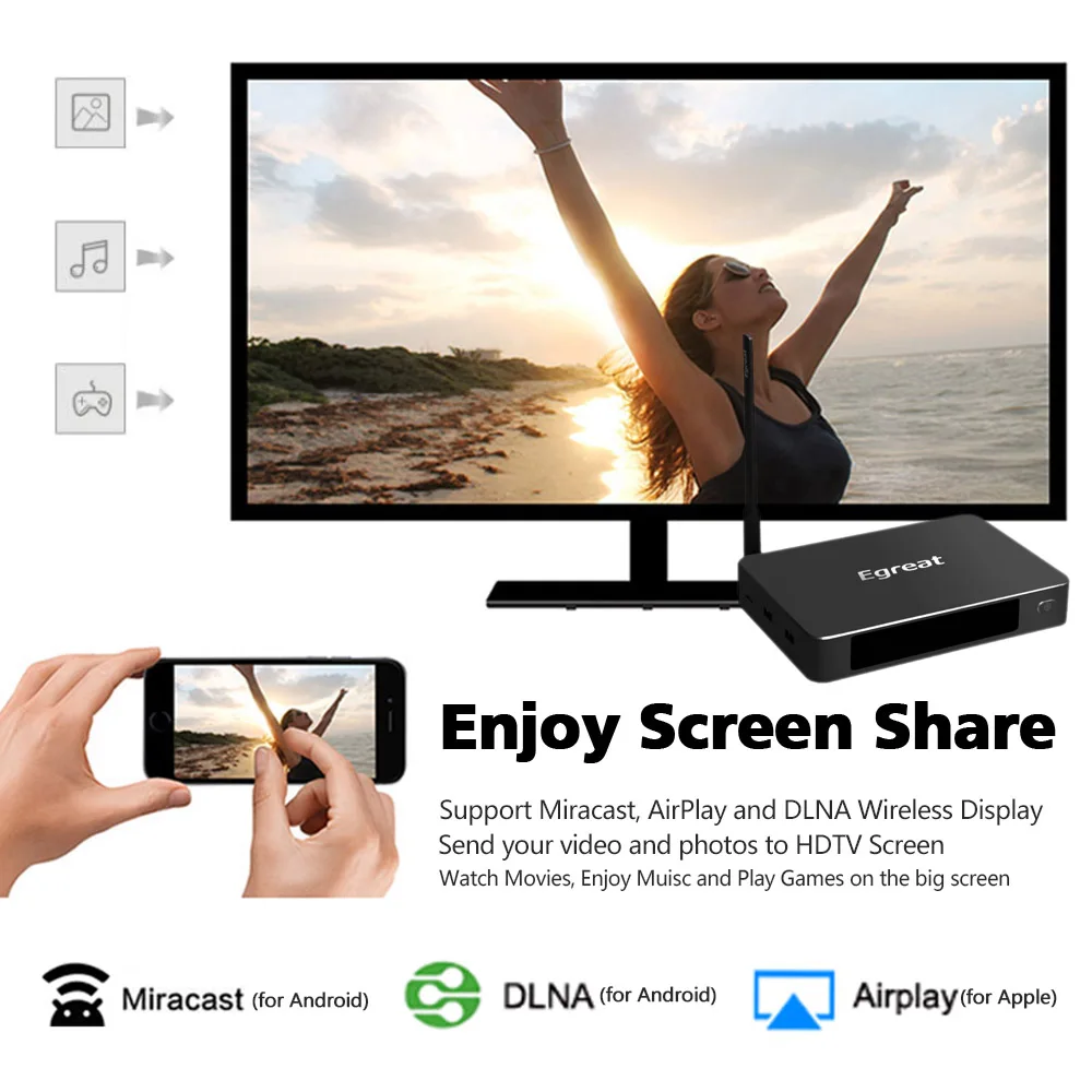 Screen Share: Support Airplay, Miracast, DLNA Protocol.