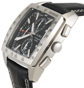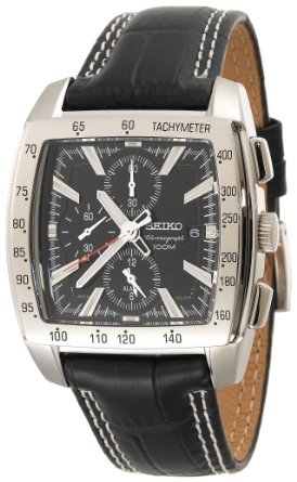 The Seiko Men''s Alarm Chronograph Watch features a large, square dial face encircled by an easy-to-read tachymeter, and includes a unique alarm subdial. The timepiece is constructed with a stainless steel case, a square, stationary stainless steel bezel with tachymeter, and a black leather wristband with an adjustable buckle clasp. A curved hardlex window protects the square black dial face, which features silver-tone hour markers. The face also includes three chronograph subdials including the alarm function, silver-tone watch hands, and a date calendar at the three o''clock position. Powered by quartz movement, the watch is water resistant to 330 feet. It is presented in a luxuriously padded Seiko case.중량: 1 pound 이쪽의 상품은 주문일로부터 배송 까지 14일 정도 시간을 받고 있습니다.스탭 일동?고객에 안심하고 거래 주시는 바와 같이(하도록) 유의하고 있습니다?