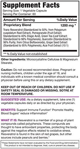 ★WHY US: Just as red wine has different varieties of grapes, fruits and flavors, so does our super Resveratrol. Resveratrol is formulated and designed for maximum effect. We use only the best ingredients designed and formulated to deliver optimal nutritional value. Call us crazy but we do not just want to stuff a bunch of grape seeds and skin into a capsule like those other guys
