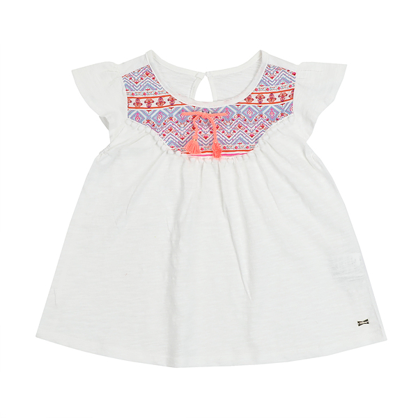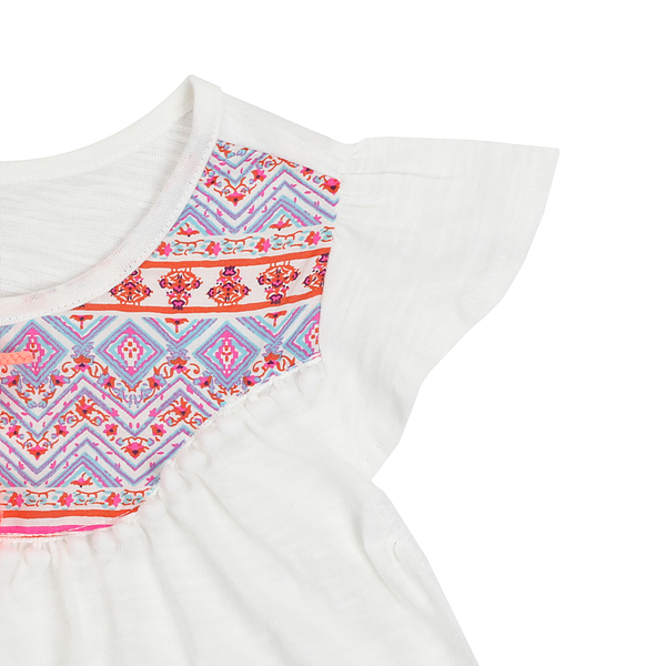 상 세 설 명-부분적으로 에스닉 프린트 원단을 믹스하여 폼폼레이스와 함께 포인트를 주었고, 형광핑크 태슬 리본 브롯치가 세트인 상품입니다. 밑단으로 갈수록 퍼지는 라인으로 편안하게 착용이 가능합니다.