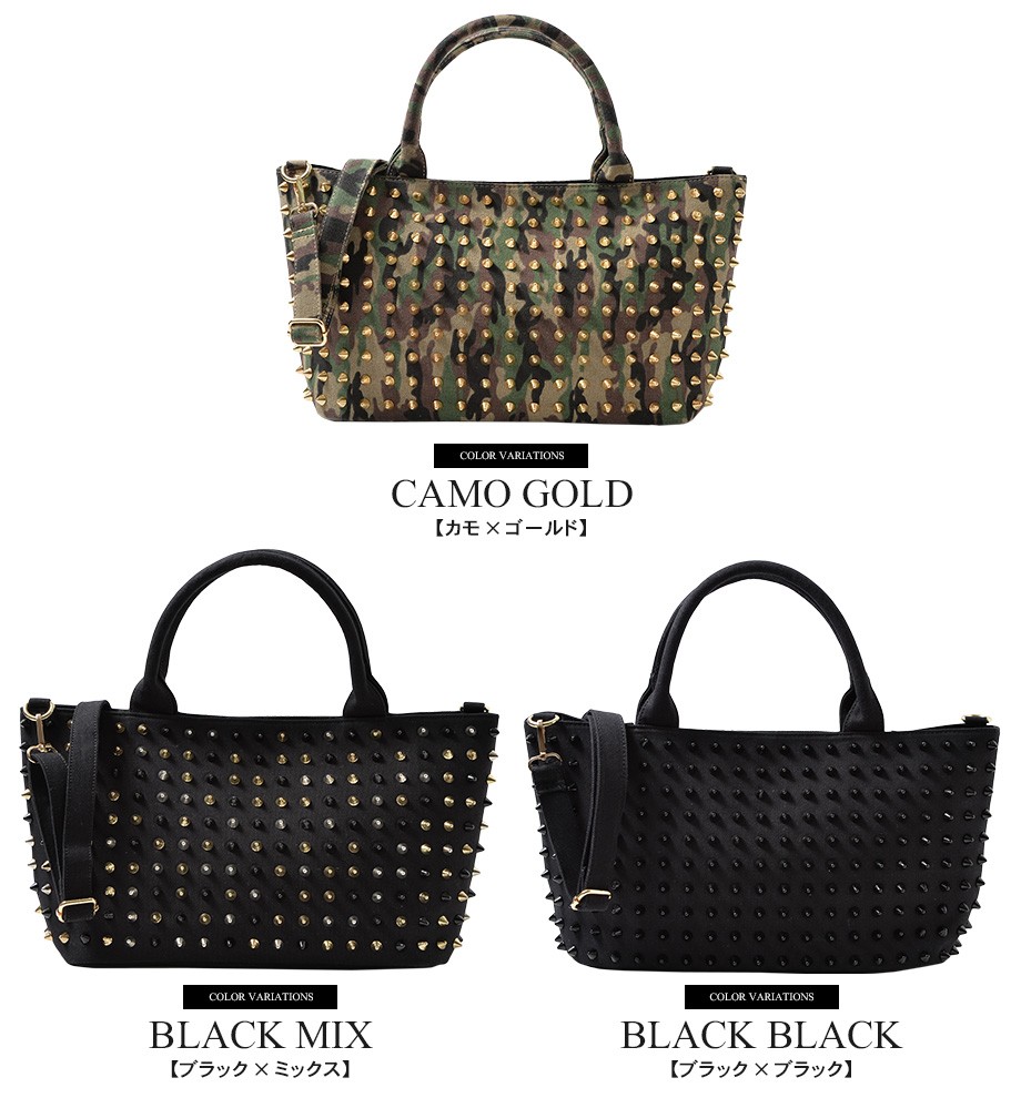 スタッズの存在感が抜群のキャンバストートバッグ。着こなしに映えるファッション性の高いデザインが魅力。サイズ感も適度な荷物が入れられる丁度良い仕上がり。トートバッグのスタイルにショルダーバッグでも使える機能性も高いアイテムです。