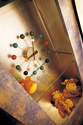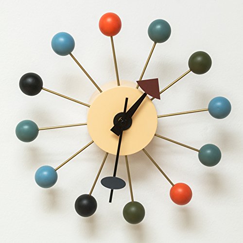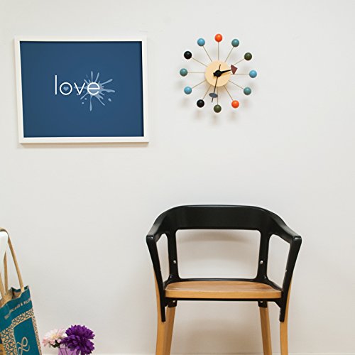 Enjoy this stunning, elegant clock with a mid-century look in any area of your home or business. Painted wood balls and metal spokes. 19-inch diameter x 3-inch depth. Requires one AA battery (included).Feature