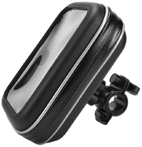 -. Feature : Phone holder provides all weather protection (snow, rain, dust, etc.) / Internal foam pads and clear viewing window provides a secure fit and will not interfere with touchscreen functions / Heavy duty handlebar grip has turn-lock knob to ensure a tight fit, holder with 360 degree rotation capability and turn-lock knob secures its position and provides flexibility / Fits devices up to 5.38" long, 3" wide