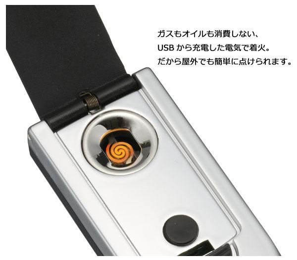 ガスもオイルも消費しない、USBから充電した電気で着火する、新しいタイプのライターです。風の強い場所でも使えます。 |