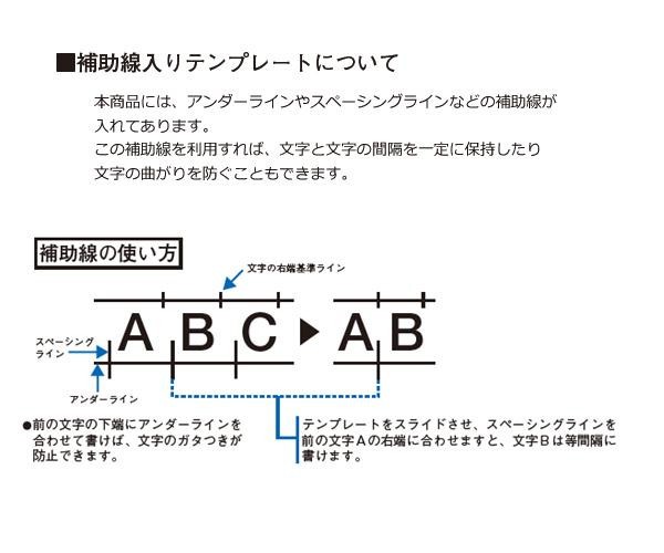 英数字を書き込む時に便利なテンプレートです。アンダーラインやスペーシングラインなどの補助線が入っているので、文字間隔を一定に保持したり文字の曲がりを防ぐこともできます。 |