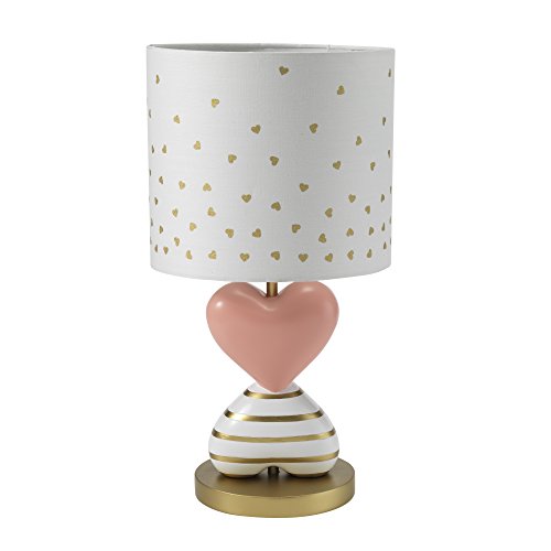 - This beautiful lamp has two hearts; one in pink and one with gold stripes and sits on a golden base. Lamp shade is filled with cascading small gold hearts