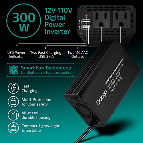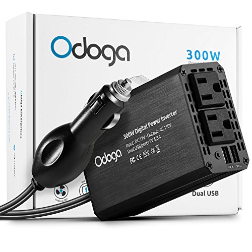 Odoga 300W Car Power Inverter DC 12V to 110V AC Car Converter with 4.8A Dual USB Car Adapter & 2 X AC Outlets | Silent, Powerful & Safe