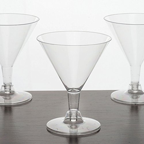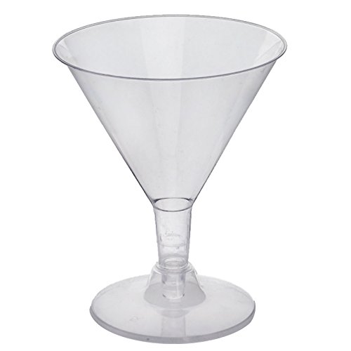 Product Description Serve with style and elegance using our chic plastic martini glasses. Their sophisticated appeal and shiny clear surface make them a great beverage-ware solution for your up-coming special event, culinary event, wedding, fundraiser, or other catered event. Their shatter and break resistance make them an ideal choice for busy establishments, deck bars, poolside cabanas, or other environments where broken glass may cause a safety issue. Easy to assemble, the top part of the glass fits snugly into the base for fast setup and after-party storage convenience. These modern glasses are perfect for specialty cocktails, sauces, appetizers, or decorative desserts. ; Measurements: 4.25" tall x 3.5" diameter wide ; Material: Plastic; Capacity: 5oz per martini glass; Qty: 60 Pcs margarita glasses / order. ; **Note: each martini glass comes in 2 pcs, requires assembly; 0