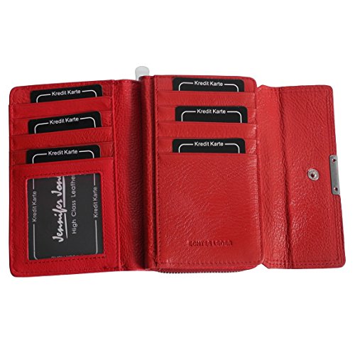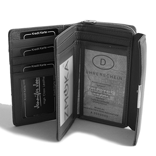 -. Feature : Beste Verarbeitungsqualität und edles Design in einem! Auch bestens als Geschenk geeignet! / Dieses stylische Damen Portemonnaie aus echtem weichen Leder, bietet reichlich Platz für alles was man mit sich führen möchte! / Ausstattung: 1 Klarsichtfach (passend für den neuen Ausweis), 9 Kreditkartenfächer, 2 große Geldscheinfächer, 2 große Klarsichtfächer (passend für den alten Ausweis und Führerschein), 1 Einsteckfach für Zettel, Quittungen u.ä., mit Druckschließe, 2 Münzgeldfächer mit Reissverschluß. / Maße ca. in Zentimeter : 14 x 9 x 4 (BxHxT), Gewicht ca. 165 Gramm / Markenqualität von Jennifer Jones - Dieses Angebot wird - präsentiert von ZMOKA®
