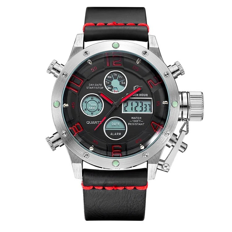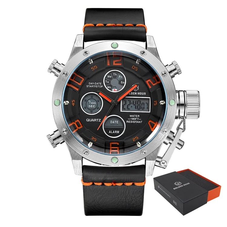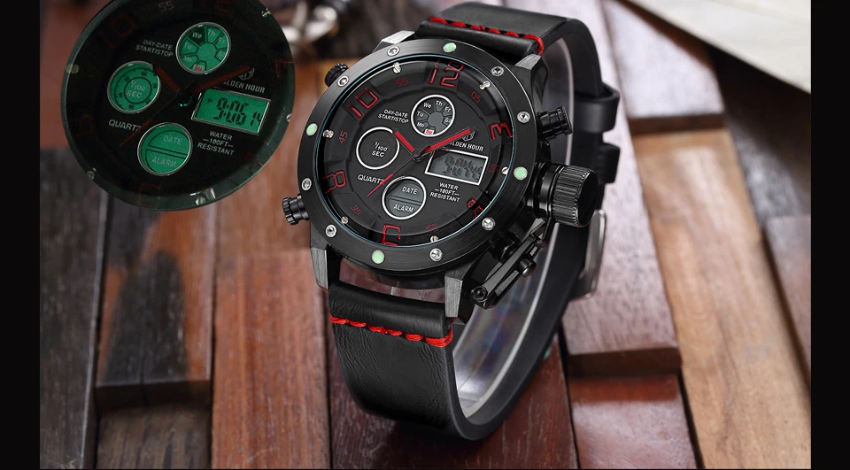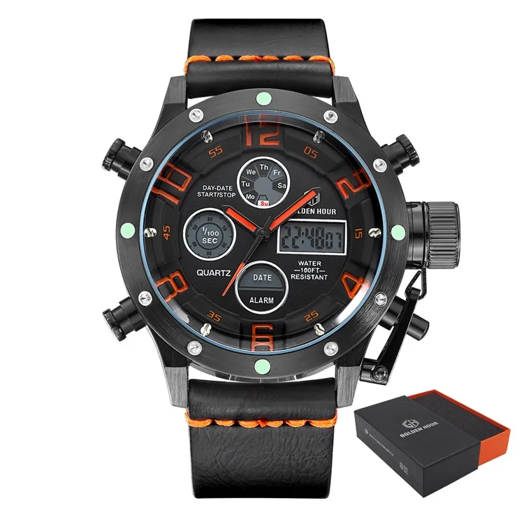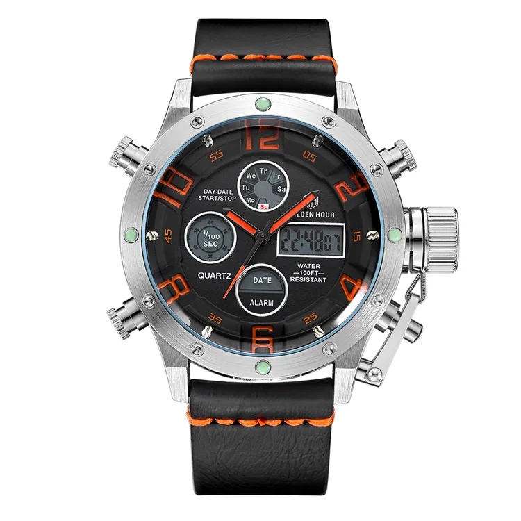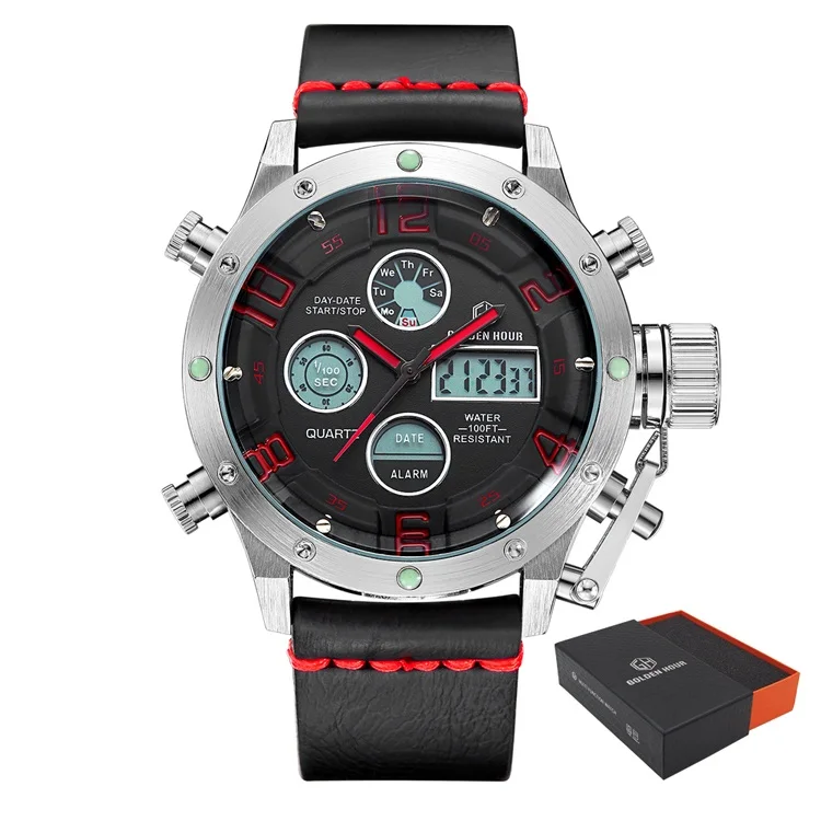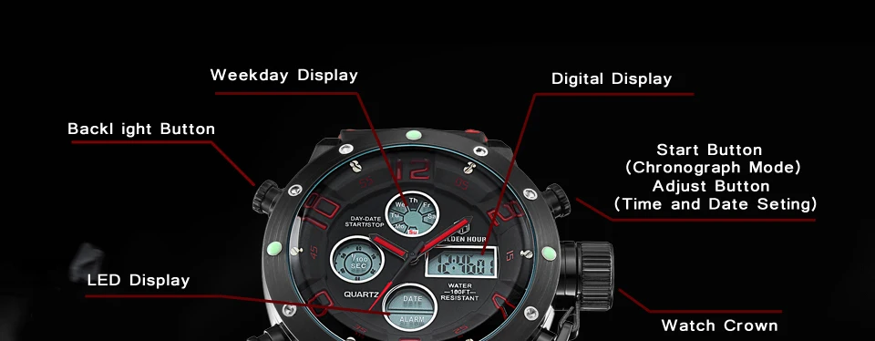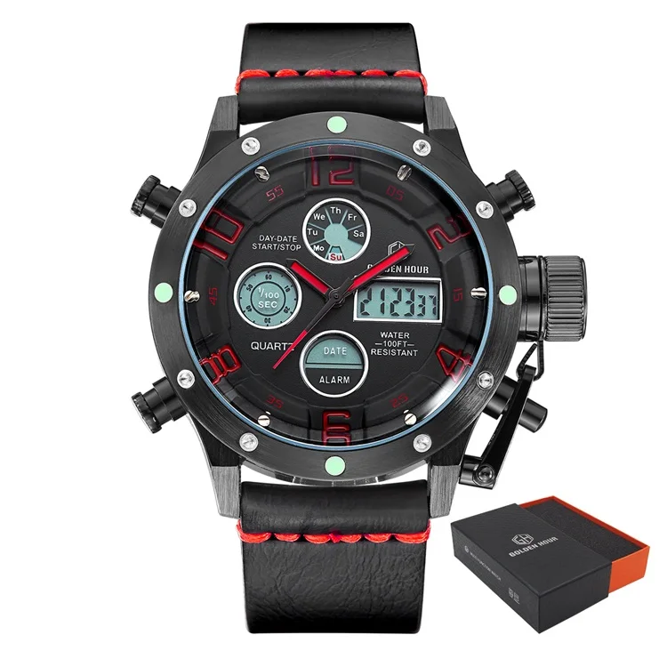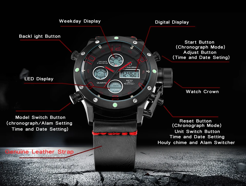 Feature:Water Resistant,LED display,Multiple Time Zone,Stop Watch,Back Light,Complete Calendar,Shock Resistant,Chronograph,Perpetual Calendar,Auto Date,Week Display,Rattrapante,Alarm
