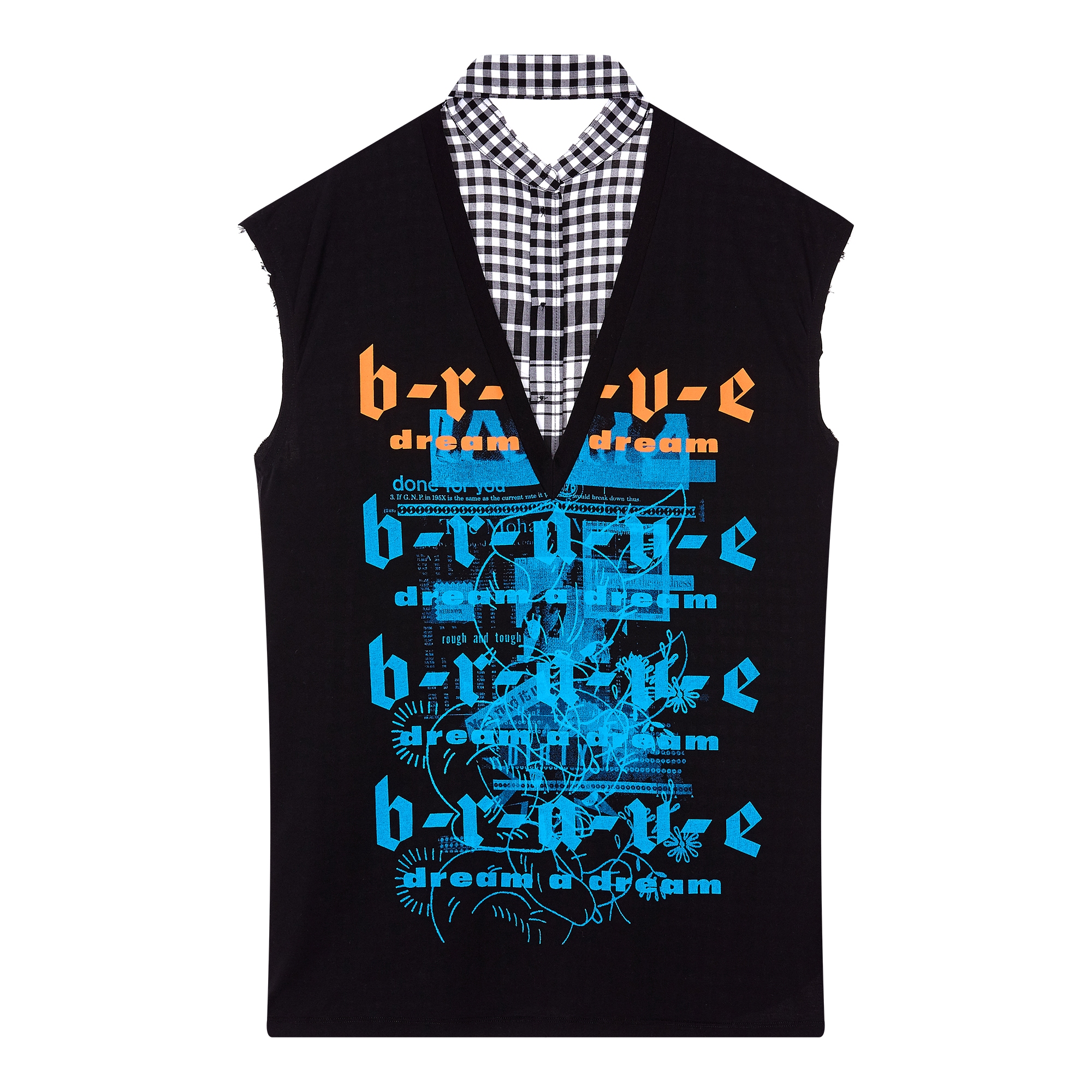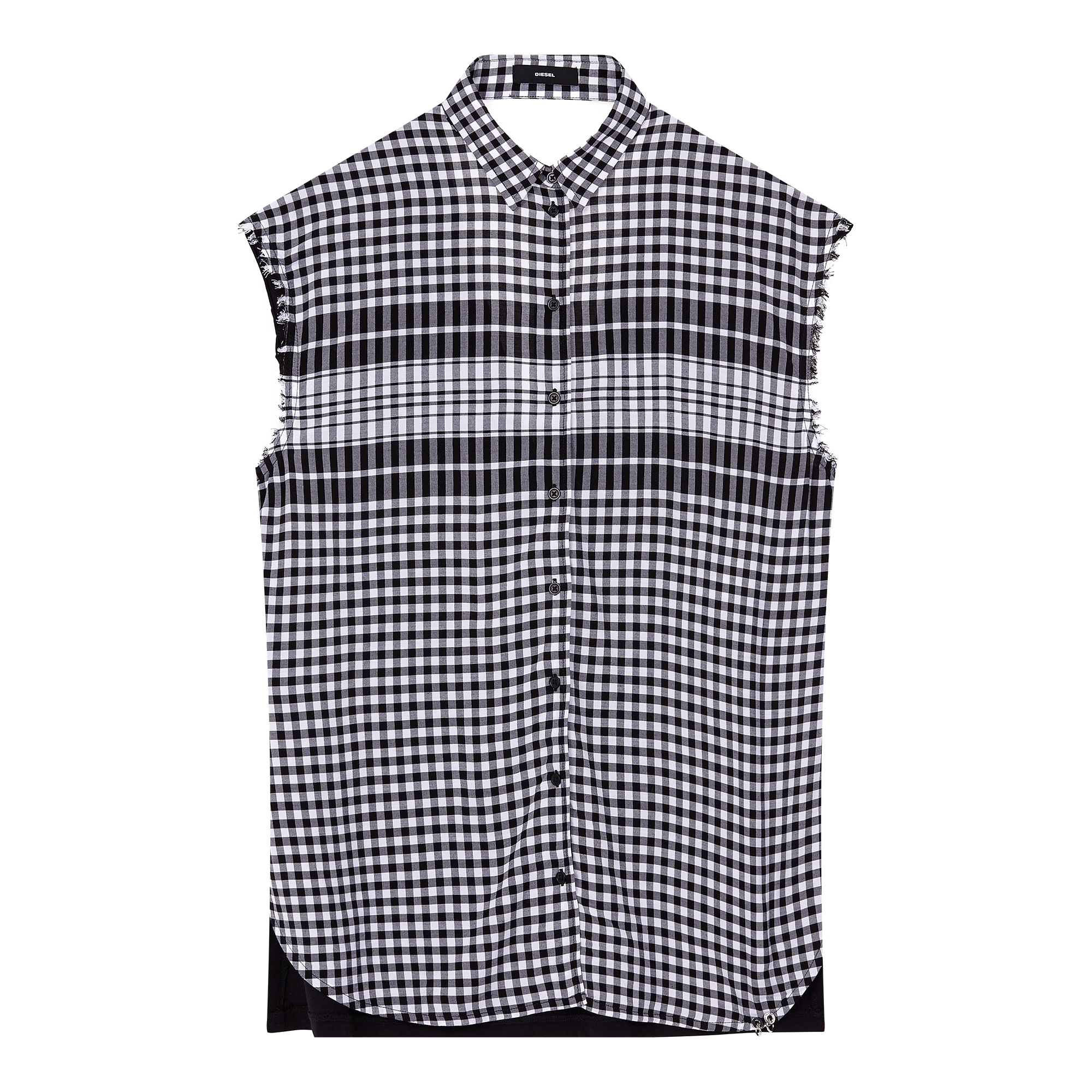 컬렉션 : 2018 Fall/Winter 디자인 포인트 : - 뒷면에 유니크한 그래픽 디테일이 돋보이는 캐주얼한 무드의 슬리브리스 셔츠- 프론트 체크 패턴 디테일로 포인트를 준 트렌디한 디자인- 레이온과 면 배색 디테일로 가벼운 착용감을 자랑하는 아이템 스타일링 추천 : 다양한 워싱의 스키니진 혹은 숏 팬츠와 캐주얼한 스타일링을 연출 할 수 있음