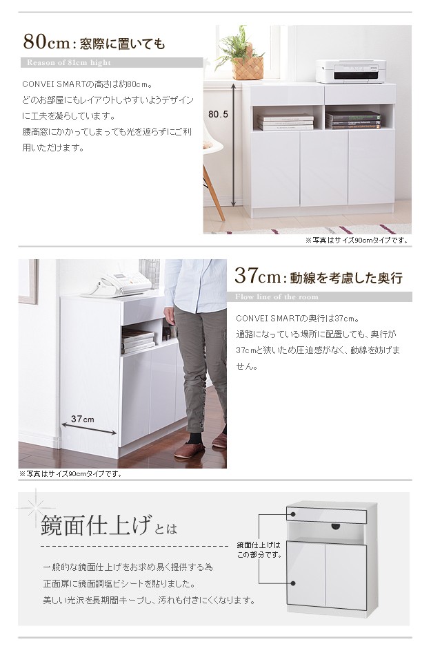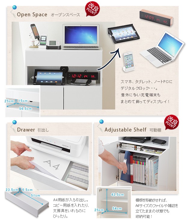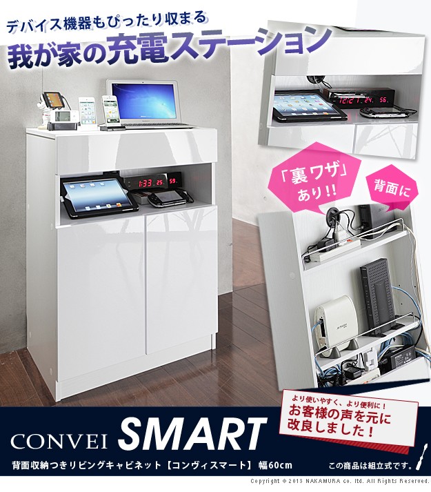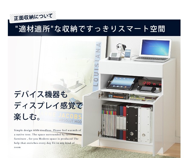 商品について:デバイス機器がぴったり収まるフラットでスタイリッシュなデザインのマルチキャビネット。オープンスペースにはコードキャップが付いているので、スマホやタブレット、ノートPCなどの充電スペースに最適☆背面収納機能付きですので、ゴチャゴチャしがちな充電器のコード類、ルーターやモデム・コンセントタップなども見えない場所にスッキリまとめられます。扉の中は可動棚1枚付き。棚板を移動させればA4サイズのファイルも立てたまま収納OK。前面はほどよい光沢の鏡面仕上げ。美しい光沢を長期間保ち、汚れも付きにくくなっています。