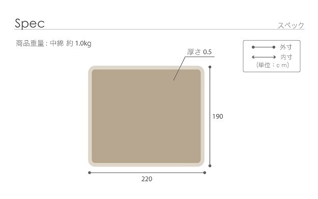 サイズ(cm):220x190cm、厚さ約0.5cm、中綿量約1kg