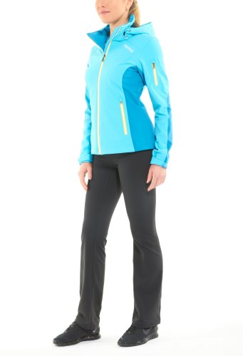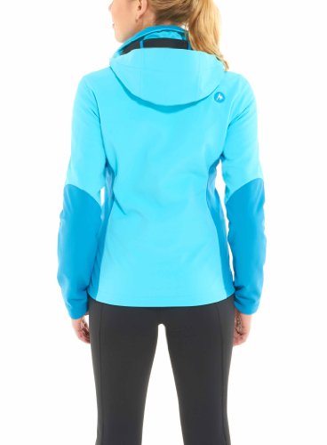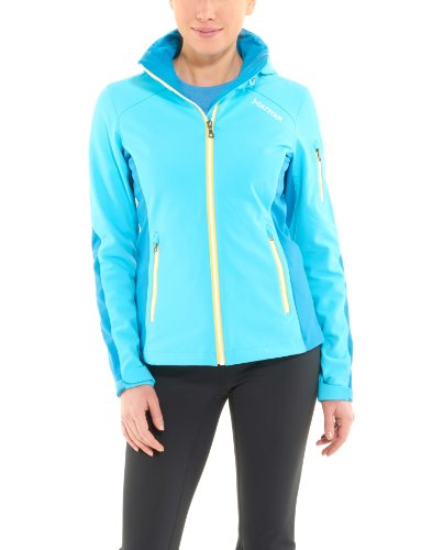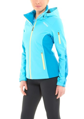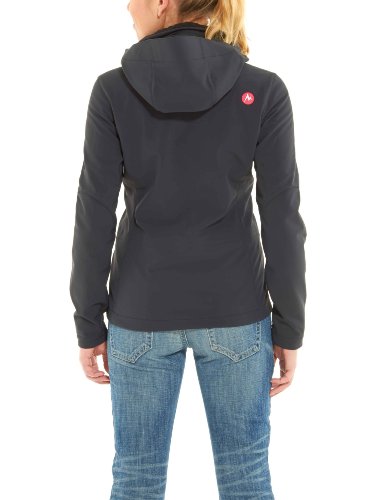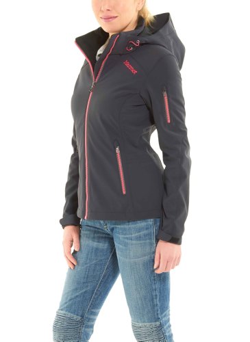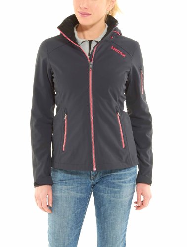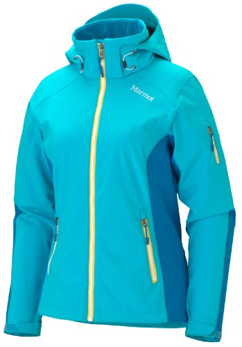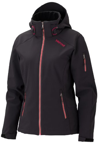 Binding : Apparel Product Description FEATURES of the Women's Bella Jacket by Marmot Marmot M1 Softshell-Water-Resistant, Breathable, Windproof, Durable, Warm, Stretch Windproof, Waterproof, and Breathable 4 way Stretch Fabric Zip-off Storm Hood with Laminated Brim Exposed Riri Water Resistant Center Front Zipper Handwarmer Pockets with Riri Water Resistant Zippers Sleeve Pocket with Riri Water Resistant Zipper Zip-off Powder Skirt-Allows Removal of Powder Skirt When Not Needed Zippered Sunglass Pocket Elastic Draw Cord Hem Adjustable Velcro Cuff Angel-Wing Movement-Allows Full Range of Motion in Arms so Jacket Doesn't Ride Up SPECIFICATIONS: Center Back Length: Medium: 25 7/8" Weight: 1 lb 9 oz / 720 g Materials: Softshell WPB 88% Nylon 12% Elastane 9.2 oz/yd 0