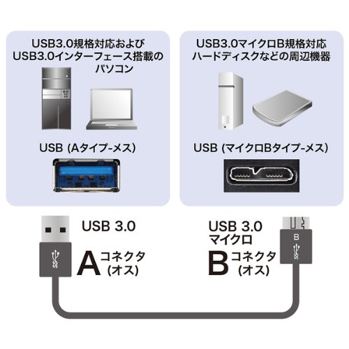 Cable shape: a personal computer with a straight USB3.0 micro-B connector very fine USB3.0 cable ◆ USB3.0 port than for peripheral devices, is a cable to connect the USB3.0 devices such as hard disk (micro USB3.0). ◆ in the small connector to the ultra-fine cable, it does not get in the way in carry along with such as GALAXY Note 3 and portable hard disk. ◆ USB3.0 (Super Speed) is correspondence. USB2.0 of about 10 times the transfer speed: is the cable corresponding to the (maximum 5Gbps theoretical value). ◆ USB3.0 SDP for the signal line (Shielded Differential Pair) line is a shield processing from the center as "aluminum shield → aluminum shield → high-density braided shield" triple, is a cable where there is a higher shielding properties. ◆ I am using a strong twisted-pair wire to noise combined than two by two the core wire. ◆ internal encased in resin molding, so more mold connectors subjected to entire surface shield processing, is also thorough noise suppression prevents external interference. Also has excellent resistance to vibration and shock resistance. ◆ resistant to rust, it uses a pin that worry is subjected to less gold processing of the signal degradation due to aging (contact). / ■ Specifications ■ Compatible models: USB3.0 can not be used in equipment models ※ USB2.0 / 1.1 with a PC USB3.0 equipment /USB3.0 micro-B connector with the A connector. Connector shape: USB3.0 A connector male - USB3.0 micro-B connector male Cable length: 0.3m Cable Diameter: 2.5mm wire standards: UL2725 / ※ It confirms it on the corresponding model, please purchase.