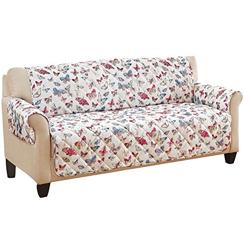 -. Feature : Protect your furniture from wear and tear, pet hair and more with this quilted furniture cover / Feature butterflies in soft shades of rose, sage, yellow and blue atop a white background / Machine washable / Made from polyester and olefin / Sizes available to fit either a chair or a sofa