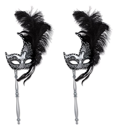 Beistle S54204AZ2 Feathered Mask with Stick, Black/Silver