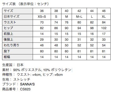 -. Feature : ブランド: SANNA'S / 生産国: 日本 / 生地: ストレッチ / 伸縮性: ウエスト: +4cm, ヒップ: +6cm / 素材: 90% ポリエステル, 10% ポリウレタン