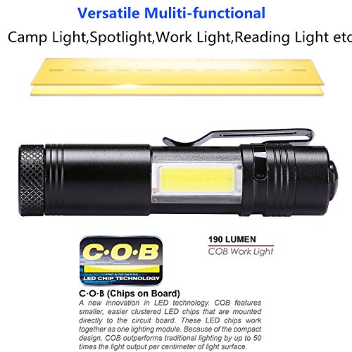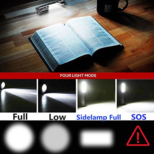 Multifunctional: Q5-XPE LED is Brighter but Save More Power; COB Light Can Offer 360° Broad Lighting. 4 Modes Full Bright, Low Bright(POWER SAVE MODE), Sidelamp Full Bright, Sidelamp SOS are Ready for Anything. Versatile as Bike Light, Tent Lantern, Torch Light, Emergency Light, Good for Hunting, Cycling, Camping, Outdoor activities