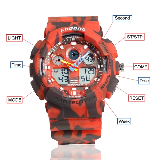 상품 내용 새로운 도착 스포츠 시계 남성 다이빙 캠핑 방수 시계 남성 시계 최고 브랜드 고급 군사 Relogio Masculino Montre 남성 스포츠 시계 듀얼 디스플레이 FODONG 브랜드 LED 디지털 시계 전자 석영 손목 선물 50 메터 방수 시계 키 포인트: 1. 기능: 듀얼, 알람, stopwatches, 크로노 LED 빛, 날짜,, 달 2. 유형: 남성 스포츠 시계 3. 운동: 아날로그 디지털 듀얼 디스플레이 4. 스트랩 재질: 고무 5. 50 메터 방수 6. 정확한 시간 7. 좋은 선물 특별한 사람 따뜻한 팁: 수 함께 수영 바랍니다 입어도 사우나 룸 또는 뜨거운 목욕 또는 따뜻한 수영장 피하기 증기 브랜드 이야기 FODONG 브랜드 시계 구성되어 업데이트 클래식 timepieces 더 패션 의식 소비자. 시계 크게 설계되었습니다, 특별 스포티 가죽, 고무 또는 금속 스트랩 신선한 만들. 우리의 시계 결합합니다, 선도 패션, 같아영 스포츠, 가치. 또한 패션 일상 캐주얼 복장. 우리의 시계 항상 좋은 값 하지만 저렴한 가격. 환영합니다 고객 즐길 우리의 시계 당신이 더 유행. 주의: 제품 100% 현물 촬영, 다른 표시 생성합니다. 표준 색상 물리적. 감사합니다! 어떻게 사용 ??? 4 키: 1빛버튼, 빛 버튼, 클릭 빛. 2모드버튼, 모드 키, 클릭 변환 다른 모드 3ST/STP버튼, ST/STP 키, 플러스 또는 마이너스, 이 좋고 표시 ST/SP 4리셋버튼, 리셋 버튼 사용되는 변환 다음글 수정 매개 변수 타이밍:모드키 부터 인터페이스, 클릭ST/STP버튼 시작, 다음글 클릭 중지 타이머, 물론 눌러ST/STP키 계속. 프레스리셋키 0:00 복원 세트 알람 시계:모드키 두번, 입력 알람 설정, 눌러리셋키 조정 시간 또는, 눌러ST/STP키 시작 시간, 동안 알람 자동으로 나타납니다 의해 플래그 (처음 세트 알람) 알람, 눌러리셋키 울리는 중지. 시간 인터페이스 동시에 눌러리셋키ST/STP키 해제 경보 (오프 후 플래그 취소) 조정 시간:모드인터페이스 세 시간 조정 키 인터페이스, 눌러리셋버튼 조정하는, 초, 개월, 일, 주 한 조정 번호 점멸, 눌러ST/STP키 조정 번호 사이즈 포장 상세