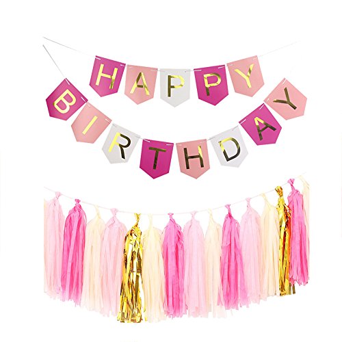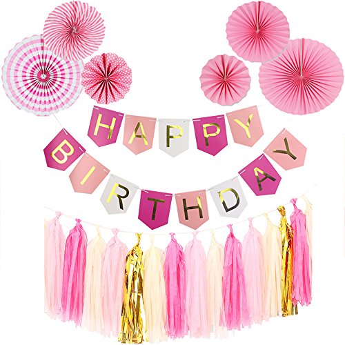 Pink Birthday Party Decorations Set: 27pcs pink birthday decorations includes One "HAPPY BIRTHDAY" Banner, 6 Pcs Pink Decorative Tissue Paper Fans and 20 Pcs Pink Theme Paper Tassels.