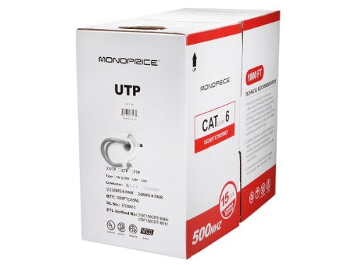 Monoprice brings you high quality, bulk rolls of Ethernet cable at unparalleled value. This high performance bulk cabling is perfect for your custom network installation projects. You can cut lengths to meet your exact needs and terminate it with our high quality modular RJ45 connectors and color matched relief boots. We also carry an extensive range of networking tools to cut, strip, and crimp your cables together. Unshielded Twisted Pair (UTP) Solid cables are both economical and practical. Solid core conduits provide better performance over longer cable runs. This cable is CMR rated, which means that it is safe for use inside the walls and between the floors of commercial class buildings. Monoprice Cat5e and Cat6 cables are made of 100% bare copper wire, as opposed to copper clad aluminum (CCA) wire, and are therefore fully compliant with UL Code 444 and National Electrical Code TIA-568-C.2 fire and safety standards, which require pure bare copper wire in Cat5e and Cat6 communications cables. Our cables are RoHS compliant and UL listed. Features: 23 AWG solid conductors 4 Twisted Pairs (UTP) 500MHz Cat6 rated PVC CMR-rated Jacket 1,000 ft. / Pull BoxFeature