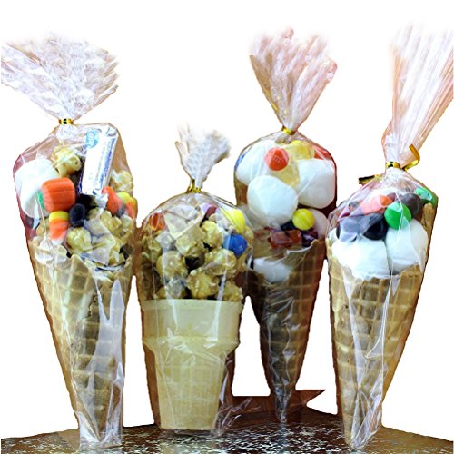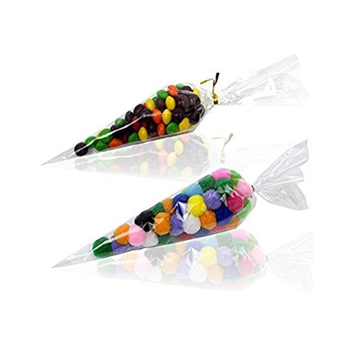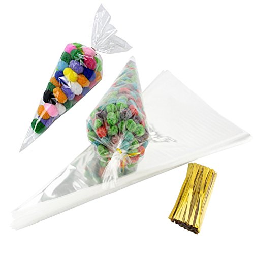 JCX 100pcs Clear Cone Shaped Treat Bags with Twist Ties for Cookie Candy Gift Cellophane Bags