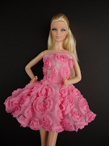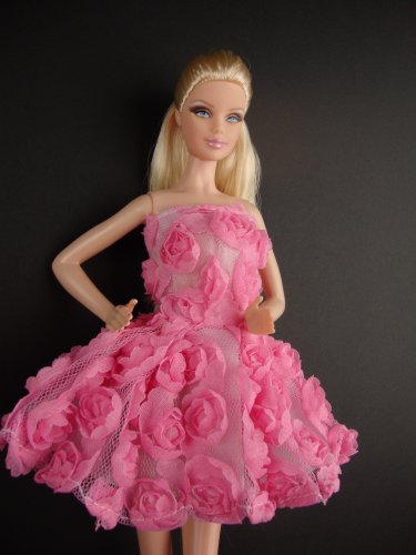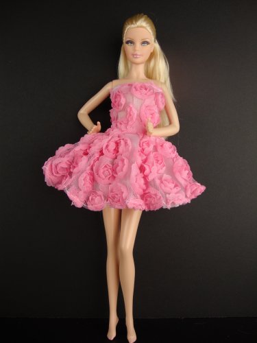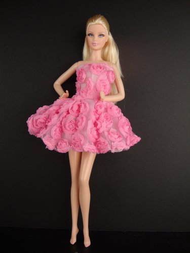 A PINK MINI DRESS COVERED IN ROSES IT SO CUTE ALSO AVAIL IN WHITE, BLUE AND GREEN MADE TO FIT THE BARBIE DOLL