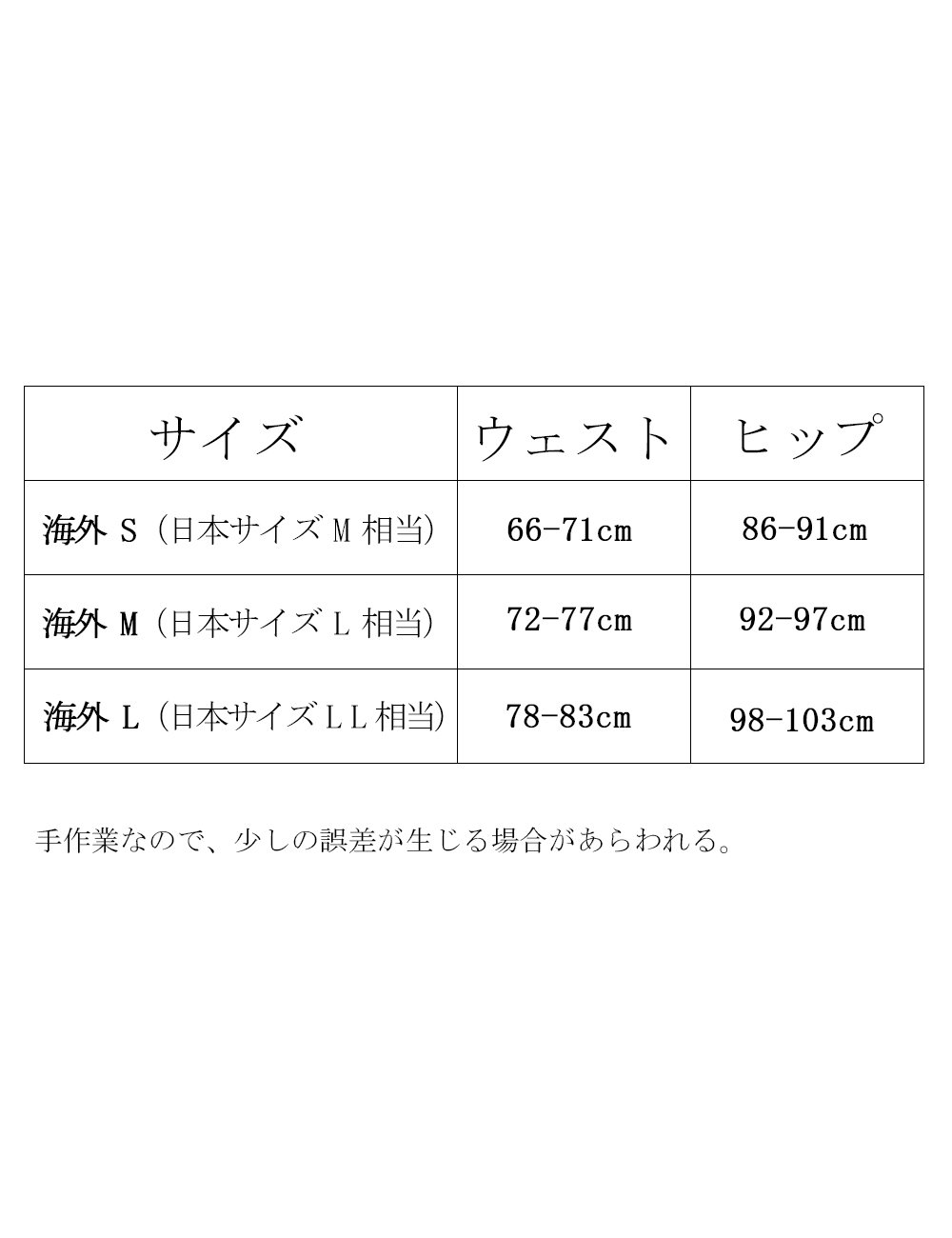 Overseas S (equivalent to Japan size M) - west: 66 - 71 cm, hip: 86 - 91 cm