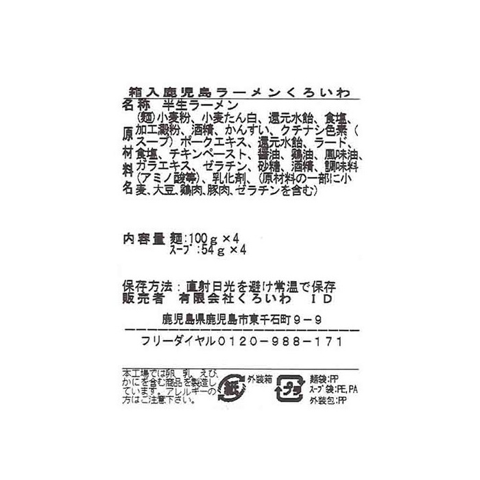 원재료:(면)소맥분,밀 단백,환원 수 엿,식염,가공 전분,주정,물어 들이마시고, 치자나무 색소(스프)포크 엑기스,환원 수 엿,라드,식염,치킨 Paste,간장,계기름,향유,갈 라 엑기스,젤라틴,설탕,주정,조미료(아미노산등)고, 유화 제,(원재료의 일부에 밀,대두,닭고기,돼지고기,젤라틴을 포함한다)