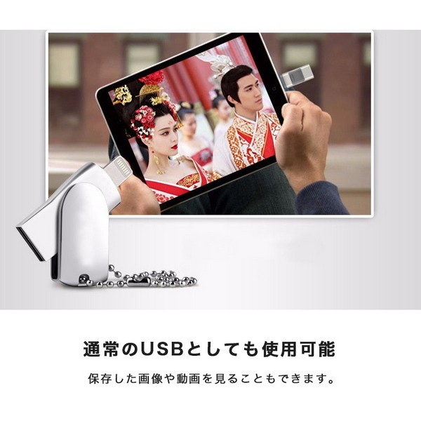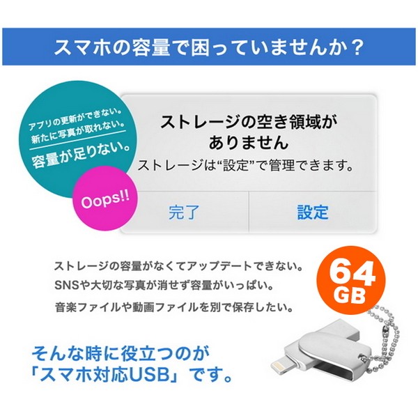 スマホの容量で困っていませんか? ・ストレージの容量がなくてアップデートできない。 ・SNSや大切な写真が消せず容量がいっぱい。 ・音楽ファイルや動画ファイルを別で保存したい。 そんな時に役立つのが 「スマホ対応USB」です。 スマホの容量問題を即解決。 音楽や動画などをこのUSBに保存しておけばiPhoneのメモリを消費せずに 必用なときだけこのUSBメモリをつないで再生することが出来ます。 iPhoneのアドレス帳やスケジュール、写真をPCを使わずにバックアップすることが出来ます。 また、USBへ移動したデータをPCにバックアップすることも出来ます。 ※Android端末で使用するには、別途ファイル管理アプリが必要です。 ■持ち運びに便利なストラップ付き 見た目もコンパクトなUSBメモリー。 ストラップがついているので無くすことなく管理ができます |