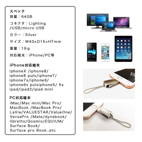 容量:64GB コネクタ: USB 2.0コネクタ USB マイクロBコネクタ Lightningコネクタ |