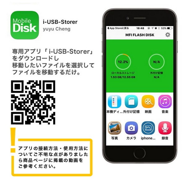 iPhoneやiPad、その他スマホ・タブレットに直接接続して 専用アプリ「i-USB-Storer」をダウンロードし 移動したいファイルを選択してファイルを移動するだけ。 ※App Storeで無料の専用App「i-USB-Storer」アプリダウンロード必要です。 ※ファイル転送時は、「i-USB-Storer」を絶対に切断しないでください。 切り替えはUSB本体中心部をスライドすることで USBとLightningのコネクタ切替が簡単に行えます。 |