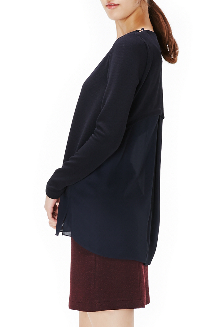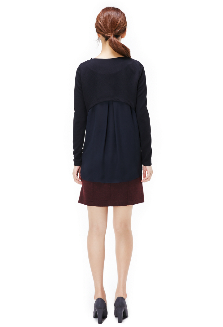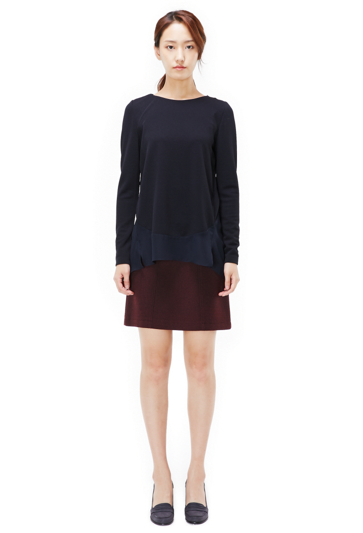 하단에 덧대어진 하늘하늘한 소재와 뒷부분의 트임이 스타일리쉬합니다.