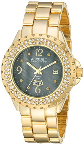 Round watch black mother-of-pearl dial, diamond-studded bezel, and date and day windows