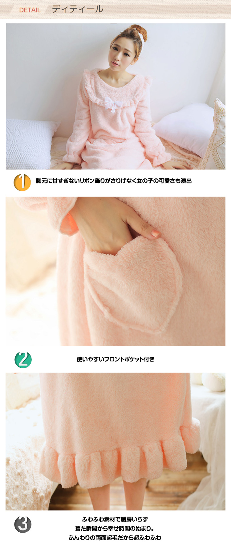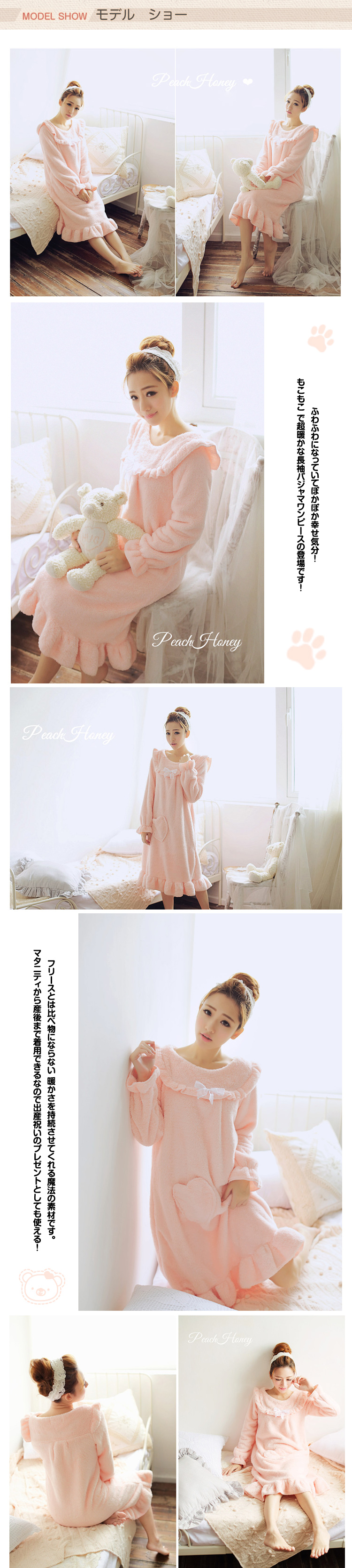 | ふわふわになっていてぽかぽか幸せ気分!もこもこ で超暖かな長袖パジャマワンピースの登場です!「超ふわふわ?」 着た瞬間から、幸せ時間の始まり。ふんわりの両面起毛だから、超ふわふわ。フリースとは比べ物にならない 暖かさを持続させてくれる魔法の素材です。マタニティから産後まで着用できるなので出産祝いのプレゼントとしても使える! | |