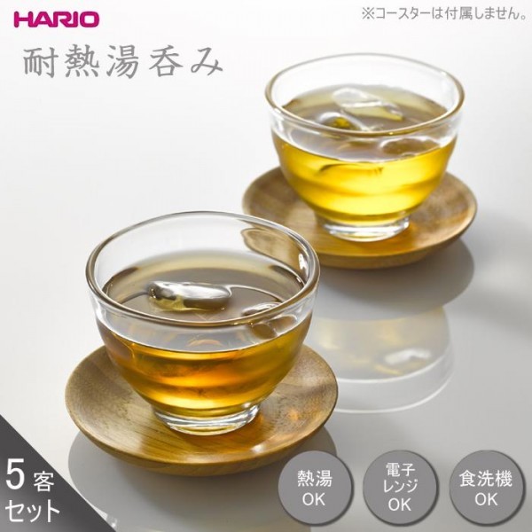 おしゃれな耐熱湯呑みです。 製造国:日本 素材・材質:耐熱ガラス 商品サイズ:径86×高63mm、口径86mm 仕様:満水容量:170ml熱湯OK電子レンジ対応食洗機対応 ※サプライヤー直送品 ご注文後3~4営業日後の出荷となります【商品名】HARIO(ハリオ) 耐熱湯呑み HU-1 5客セット