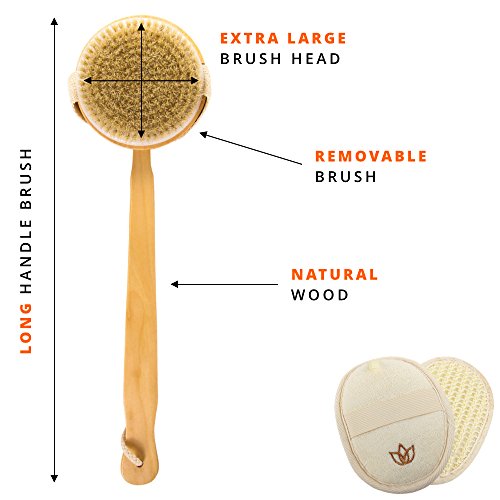 - DURABLE DESIGN & QUALITY MATERIALS - The unique design of the Earth Essence Bath Brush’s Long Handle with detachable bathing brush makes it easy to give yourself an effective and relaxing body massage without stretching or straining. We’ve used quality bristles from natural fibers that won’t scratch your skin, a wooden brush base with canvas hand strap, and a wooden handle for hard-to-reach places. It’s easy to pamper yourself and support the good health of your skin!