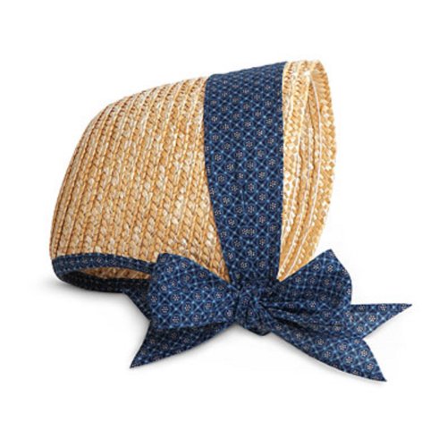 A straw bonnet with a calico ribbon to tie beneath Addy's chin