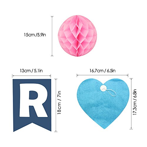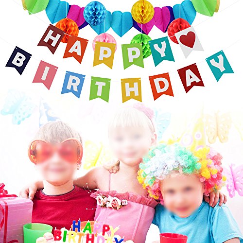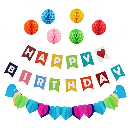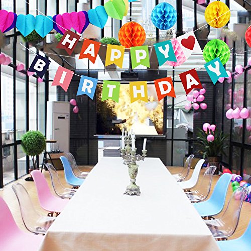 Package: 1x Happy birthday banner 1x Rainbow paper garland 6x Paper Honeycomb Pompoms 0