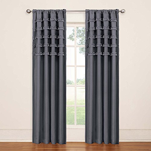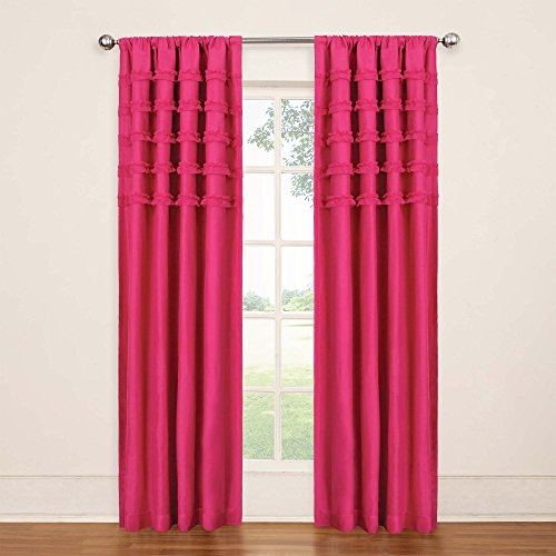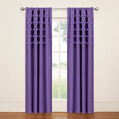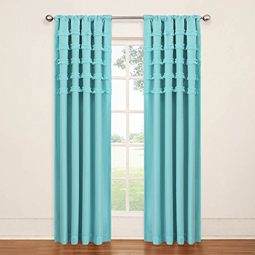 Experience the darkness, silence and beauty of eclipse kids ruffle batiste curtains. Eclipse blackout panels have been laboratory-tested to block out over 99% of intrusive light, unwanted noise and can help you save on home heating and cooling costs. Eclipse curtains offer a unique blend of fashion and function for any home decor. Perfect for daytime sleepers of all ages, home theater enthusiasts and energy saving conscious home owners, eclipse curtains offer style versatility for any living space. Use in kid's room or nursery, providing the ideal sleep environment for the whole family. The patented Thermalayer process transforms ordinary drapery panels into an energy efficient panel. The innovative triple-layer design allows you to enjoy all of the light-blocking, noise reducing and energy saving benefits, while providing the same fashionable style and elegance of naturally flowing curtains. Hang two or more curtain panels on a standard or decorative rod for optimal coverage and desired effect. Sold as a single rod pocket panel. 3" rod pocket fits up to a 2.5" Rod. Panel measures 50" wide by your choice of 63" or 84" long. Playful solid colors are complemented by five rows of coordinating sheer ruffles. Panels are available in fog grey, pool turquoise, purple, raspberry pink and white. Fits up to a 2.5" Rod. Rod sold separately. 100% polyester. Machine wash gentle cycle, tumble dry, do not bleach. Imported.Feature
