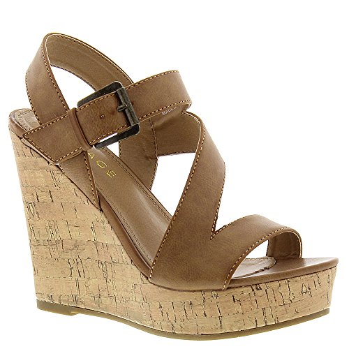 Wide-strapped sandal featuring towering cork-covered platform wedge heel