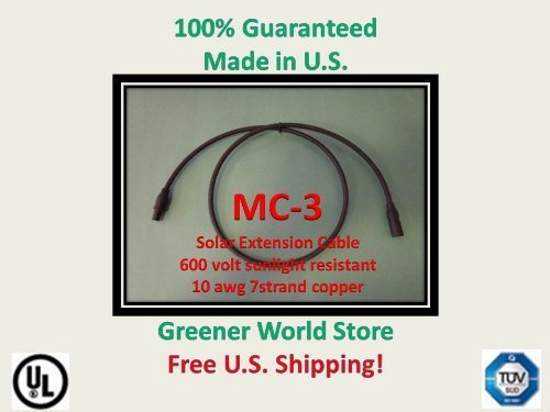 -. Brand : Greener World Store products -. Feature : Solar Connector Cables 50 feet 10awg with Mc3 at each end. / Made with High Quality TUV, and UL Rated Components. / Low price shipping to U.S. and Canadian buyers. Visit our store for all sizes! / FREE Shipping & Engineered for Long Life and Outdoor Applications. / Certified Product by Greener World Store Brand Cables are 100% Guaranteed! -. Label : Certified Greener World Store .com -. Manufacturer : Certified Greener World Store .com -. Model : 50-mc3-10 -. MPN : 50-mc3-10 -. PackageQuantity : 1 -. PartNumber : 50-mc3-10 -. ProductGroup : Lawn & Patio -. ProductTypeName : OUTDOOR_LIVING -. Publisher : Certified Greener World Store .com -. Studio : Certified Greener World Store .com -. Title : 50 Foot Mc3 Solar Cable for Photovoltaic Solar Panels with Mc3 Solar Connector Cable 50 Feet Long and Mc3 Connectors At Each End. by TUV Rated Greener World Store Branded